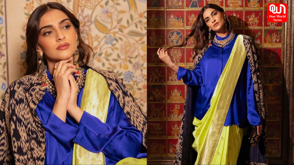 Sonam Kapoor Stuns in Yellow Saree with Cobalt Blue Shirt for a Bold Diwali Look