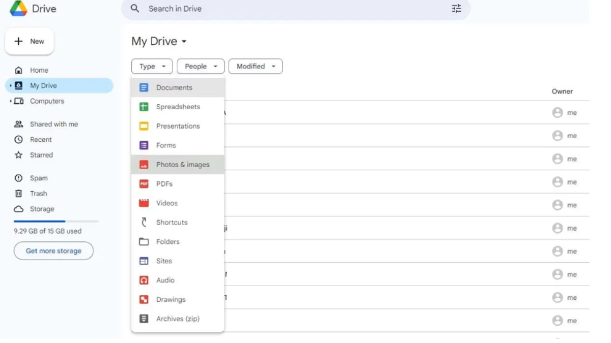 - Tap the My Drive tab on the left, press Type, and select the type of data you need to restore.